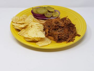 Slow-cook shredded pork coated in Rosie’s Barbecue Sauce - not too sweet and just a little tangy. Served with onion & sliced dill pickles. Served w/ chips.