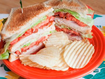 Oven-roasted turkey, bacon, tomato, lettuce, mayo on toasted bread.