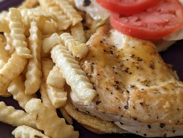 Lightly seasoned and juicy dressed with lettuce, tomato, and honey mustard. Served with fries or tots.