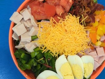 Large salad featuring spring mix topped with diced turkey, ham, bacon, bell peppers, and tomato plus hard-boiled egg, shredded cheddar & choice of dressing.