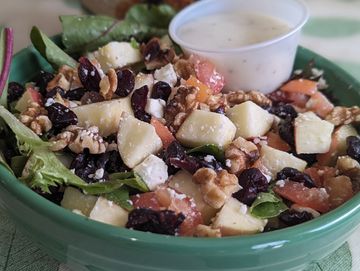 Large salad featuring spring mix topped with crumbled walnuts, dried cranberries, diced apple, grape tomatoes, feta cheese, and Poppyseed Dressing.