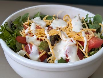 Small salad topped with tomatoes and shredded cheddar. Choice of ranch, Italian, poppyseed or raspberry vinaigrette. Grilled or fried chicken add on: $2.49