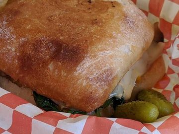Grilled spinach, sweet peppers, onions, mushrooms, and tomatoes plus melted Pepper Jack cheese & our Roasted Red Pepper Aioli on ciabatta bread.