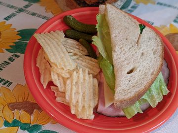 Ham, Swiss cheese, lettuce, sliced tomato, and honey mustard.