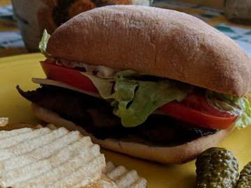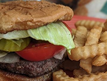 1/3 pound ground beef patty lightly seasoned dressed with lettuce, onion, tomato, and sliced dill pickle. Cheese or bacon extra. W/ fries or tots.