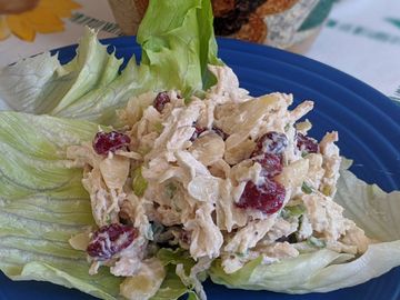 Chicken salad with mayo, dried cranberries, almonds, and green onions. Served on lettuce leaf with option to serve on bread/toast ($1.00 more) or croissant ($1.80 more).