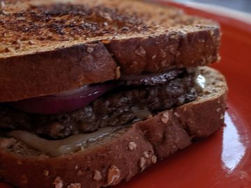 1/3 pound smash burger topped with caramelized red onion and Swiss cheese. Served on grilled rye. W/ fries or tots.