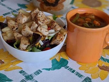 Cup of any soup paired with a Garden Salad or small Spinach Bacon Salad. Pair with 1/2 Apple Walnut for $2.99 more.