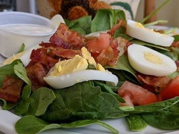 Medium spinach salad topped with chopped egg, bacon and tomato was inspired by a friend's request for a BLT on spinach.