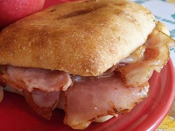 Grilled turkey, ham & bacon, Pepper Jack cheese & our Brown Mustard Mayo on ciabatta bread. Served with chips.